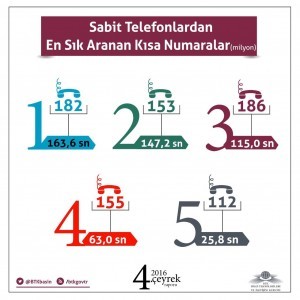 Bilgi Teknolojileri ve İletişim Kurumu (BTK) tarafından hazırlanan, 2016 Yılı Ekim, Kasım, Aralık aylarını kapsayan ve 2016 yılının bütününe ilişkin büyüklükleri de içeren 4. Çeyrek Pazar Verileri Raporu’nda belirtilen rakamlara göre en sık aranan kısa numaralar şu şekilde: