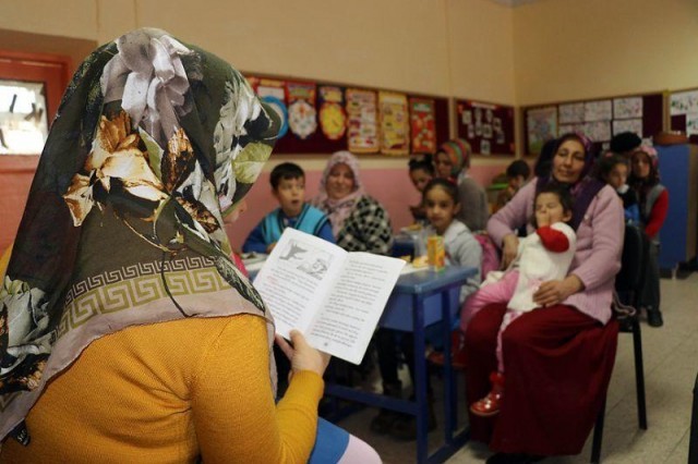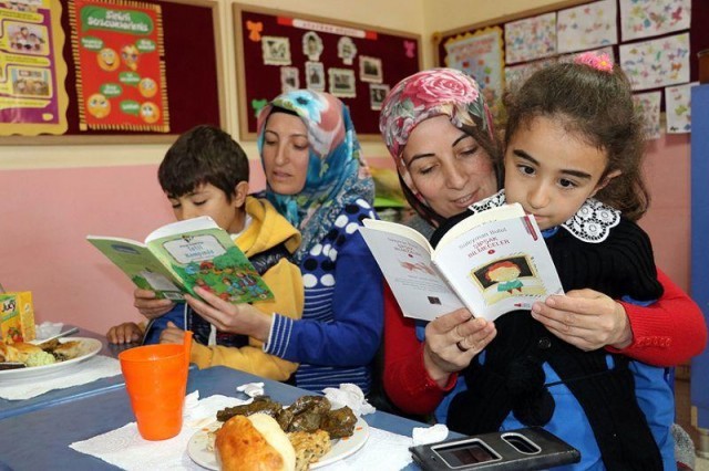Normalde altın günü için hazırladıkları pastaları, börekleri okula getiren kadınlar çocuklarıyla birlikte kitap okumanın zevkini çıkarıyor.