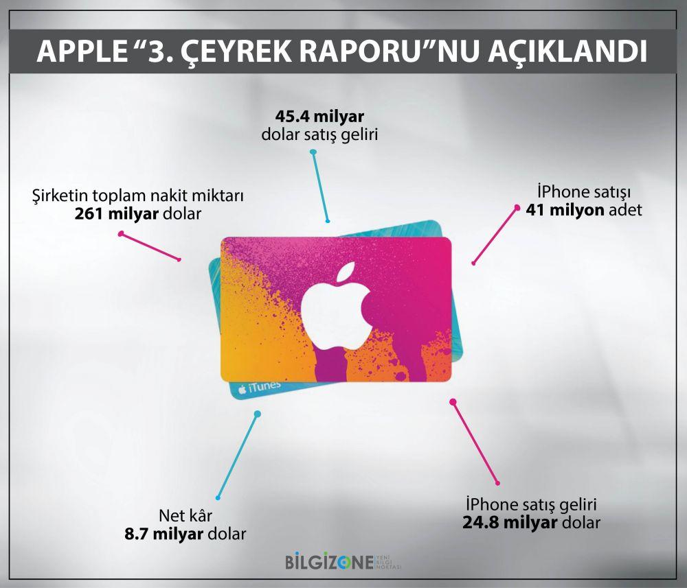 Açıklamada, şirketin toplam nakit miktarı 261 milyar doları bulduğu belirtilirken, 4 milyar dolar da satış geliri bulunuyor. 41 milyon adet iPhone satışı gerçekleştirilirken, iPhone satış geliri 24.8 milyar doları buldu. Şirketin net kârı ise 8.7 milyar dolar.