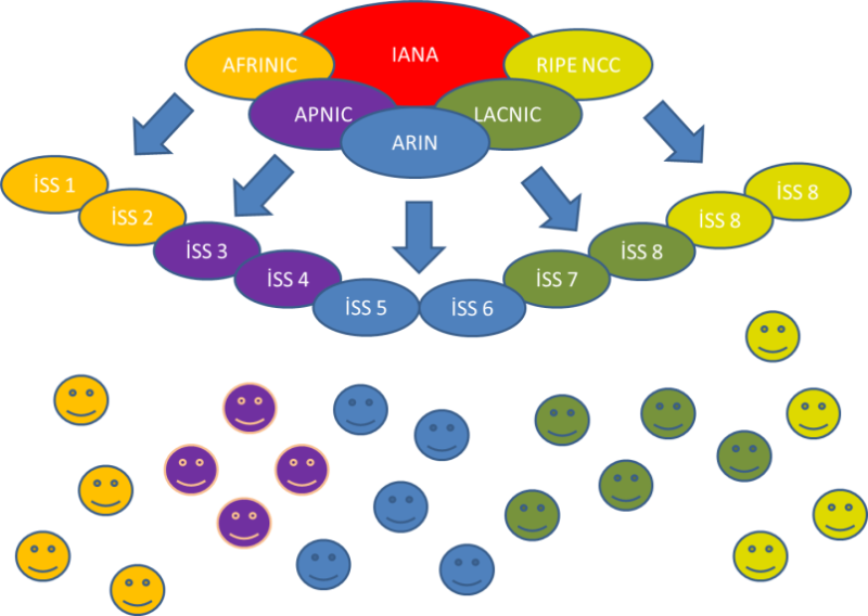 IP numaralarını sağlayan ve bizi internet dünyasına eriştiren farklı farklı “İnternet Servis Sağlayıcı” firmaları bulunmaktadır. Ülkemizdeki İSS’ler http://yetkilendirme.btk.gov.tr/Yetkilendirme/ sayfasında yer almaktadır ve en bilinenleri TTNET (Türk Telekom), SUPERONLINE (Turkcell), VODAFONE NET (Vodafone) ve TÜRKSAT’tır. İSS’ler bize IP sağlamadan önce kendileri adına IP numaraları almaları gerekmektedir. Dünyadaki tüm IP numaraları tek bir kuruluş tarafından yönetilir. Internet Assigned Numbers Authority (IANA)(https://www.iana.org/) adındaki bu kuruluş ülkelere göre, ülkedeki internet servis sağlayıcılara göre IP numaralarını planlar ve dağıtır. IANA kendi içinde coğrafi olarak 5 bölgeye ayrılmıştır. Türkiye bunlardan RIPE NCC bölgesine bağlıdır.