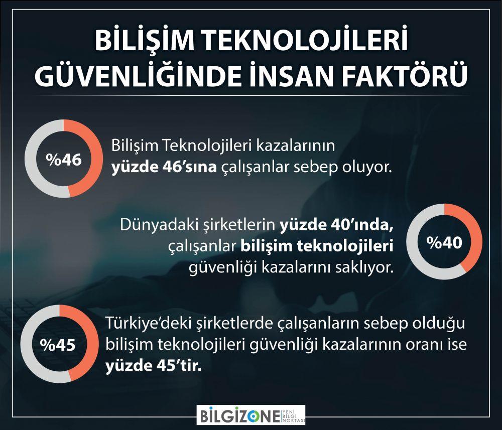 Türkiye’de ise bu oran %45; yani dünya ortalamasının üzerinde seyrediyor. Ayrıca her yıl BT güvenliği kazalarının %46’sına çalışanlar sebep oluyor ve dolayısıyla şirketlerin bu zayıf noktasının sadece BT güvenliği departmanlarınca değil, birçok seviyede ele alınması önem taşıyor.
