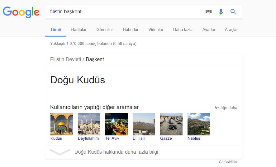 Bu değişikliğe rağmen hala Google’da Kudüs için yapılan aramalarda İsrail sonucu çıkıyor. Çünkü Google’da hala ‘İsrail başkenti’ diye arandığında Kudüs; ‘Kudüs’ diye arandığında ise İsrail’in başkenti sonucu çıkıyor.