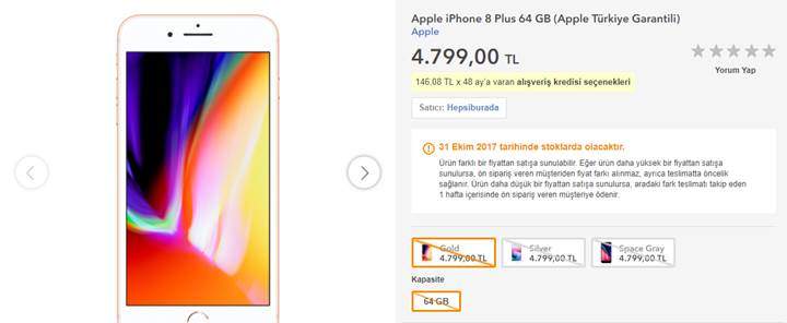 n11.com ve hepsiburada’da siparişe açılan iPhone 8 ve iPhone 8 Plus modelleri sırasıyla 4.199 TL ve 4.799 TL fiyat etiketi ile satışa sunulmuş durumda.