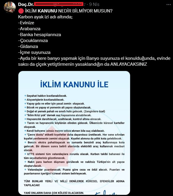 Bazı sosyal medya paylaşımları, Türkiye İklim Kanunu’nu gerçek dışı ve korkutucu bir şekilde tanıtıyor. Örneğin, bir paylaşımda şöyle deniyor: