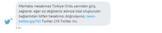 Kullanıcılara “Twitter Destek” veya “Twitter Uyarı” başlığı ile aşağıda gördüğünüz gibi uyarı mesajları gönderiliyor.
