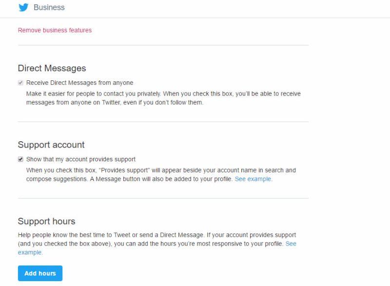 Karşınıza gelen formdan “Direct Messages” butonuna işaretleyerek profilinize mesaj butonunu eklemiş olacaksınız. Profilinizde yanıt vereceğiniz saatleri aktif etmek isterseniz “Support account” butonunu işaretleyerek “Add hours” kısmından saatleri ekleyebilirsiniz.